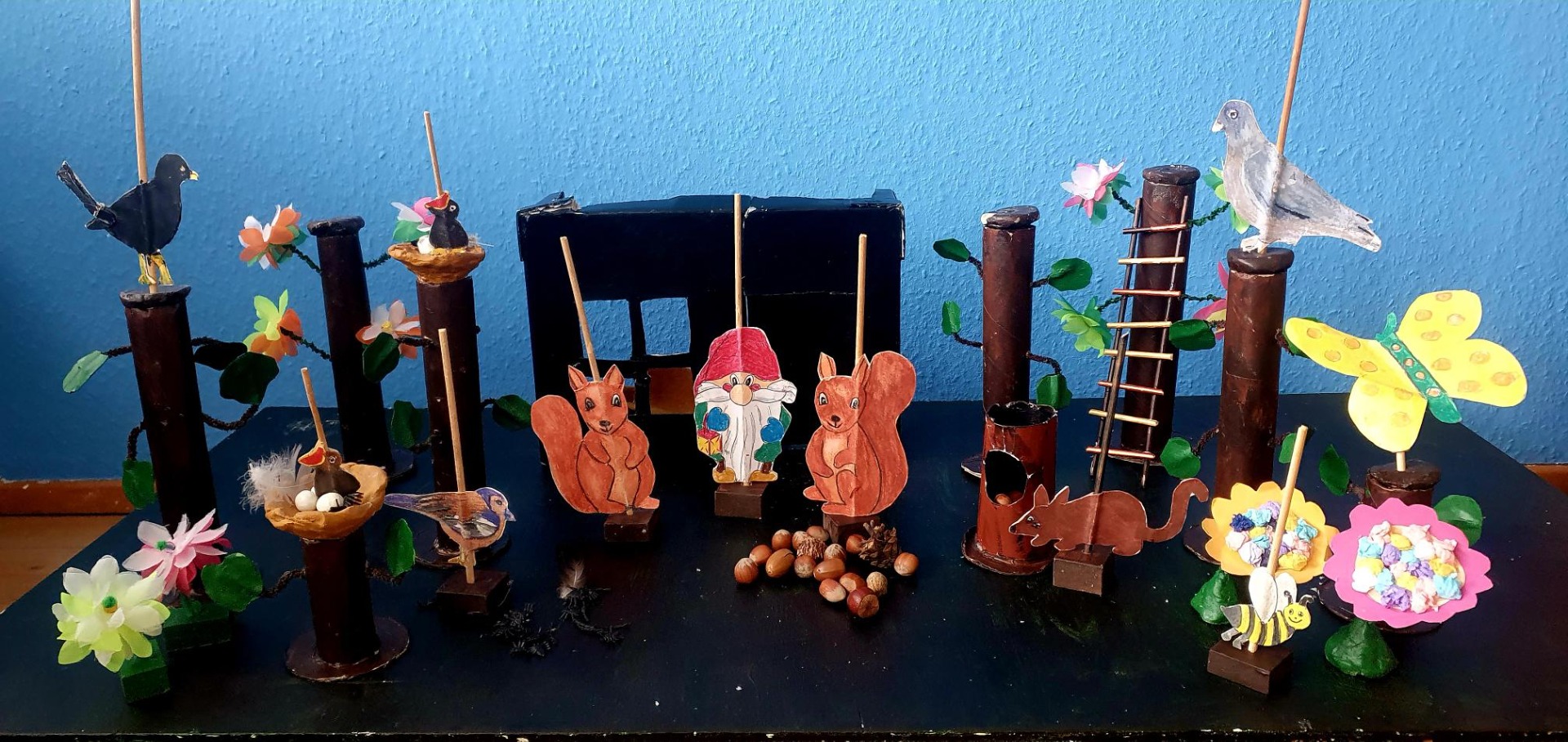 Historierne laver jeg selv, ligesom jeg hele tiden og laver nye figurer, der indgår i historierne. Ofte bliver jeg inspireret af børnene deltagelse men også ud fra ønsker og temaer, som den enkelte børnegruppe arbejder med og som jeg støtter op om/ inspirerer til.